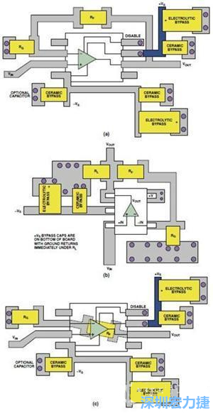 圖9. 同一運算放大器電路的布線區別。(a)SOIC封裝,(b)SOT-23封裝,(c)在PCB下面采用RF的SOIC封裝。