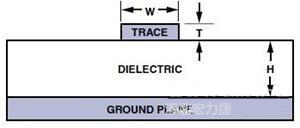 H表示從接地平面到信號印制線之間的距離,W表示印制線寬度,T表示印制線厚度;全部尺寸均以密耳(mils)(10-3英寸)為單位。εr表示PCB材料的介電常數。