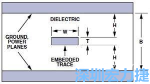帶狀控制阻抗印制線(參見圖14)采用了兩層接地平面,信號印制線夾在其中。這種方法使用了較多的印制線,需要的PCB層數更多,對電介質厚度變化敏感,而且成本更高——所以通常只用于要求嚴格的應用中。