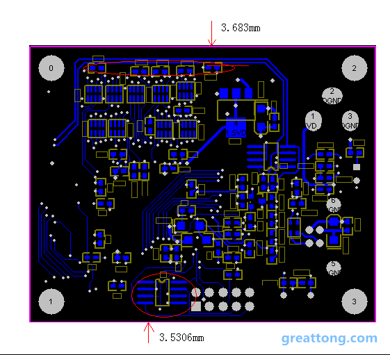 如此排版會給返修造成困難,返修時必須先拆數(shù)碼管,還有可能造成數(shù)碼管損壞。建議將數(shù)碼管底下的電阻排到Bottom面,如下圖: